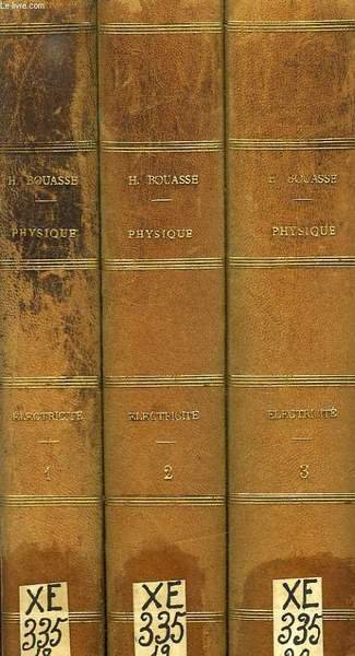 Librairie Delagrave. 1914-1916. In-4 Carré. Relié demi-cuir. Etat d'usage. Couv. défraîchie. Dos fané. Quelques rousseurs. 448 pages pour le tome I, 559 pages pour le tome II, et 654 pages pour le tome III. Illustrés de très nombreux graphiques et schémas en noir et blanc dans le texte. Auteur, titre et filets dorés sur les dos. Etiquettes de code sur les dos. Tampons et annotations de bibliothèque en pages de titre. Dos tachés et très frottés, avec fortes épidermures. Plats et bords des plats très frottés. 1er plat du tome I abîmé avec manque en surface. Annotations au crayon dans le texte. 2e édition refondue. Cours de Physique, tome troisième. Tome I: Etude du champ magnétique. Tome II: Applications 'Aimants et életros, Compensation des compas, Dynamos, Alternateurs, Transformateurs, Télégraphes et Téléphones). Tome III: Etude du champ électrique (Electricité statique, Diélectriques, Forces électromotrices, Piles, Ions gazeux et Electrons).