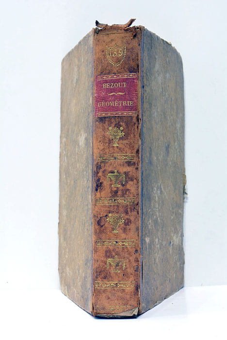 153 pages. 8 feuillets. Plusieures planches déplaintes hors-texte. (20,5x13cm). Plein cuir. Dos orné avec titre et auterur en lettres dorées. Couverture ert dos frottés avec manques de cuir. Déchirures marginales. Coins et coiffes émoussés. Publié à Paris en 1825, cet ouvrage constitue la seconde partie d'un cours de mathématiques conçu par Bézout, enrichi de notes sur la géométrie par A.-A.-L. Reynaud. Ce texte s'inscrit dans un contexte post-révolutionnaire français, où l'éducation et la diffusion des connaissances scientifiques connaissent un essor significatif. Reynaud, en ajoutant ses notes à l'œuvre de Bézout, contribue à l'évolution de l'enseignement mathématique, en mettant l'accent sur la géométrie, discipline fondamentale pour les ingénieurs et les scientifiques de l'époque. Papier bruni, taches et fortes rousseurs. Pages un peu déformés. Cahier légèrement déboîté. Planches hors-texte.