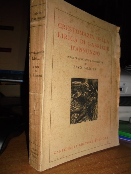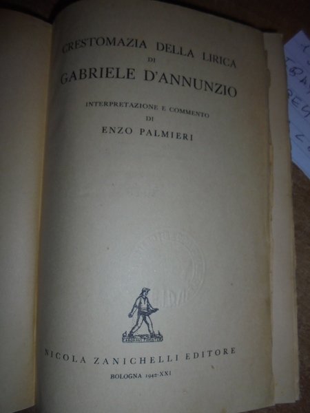 Crestomazia della lirica di Gabriele D' Annunzio. Interpretazione e commento di Enzo Palmieri. Bologna, Zanichelli, 1942. In-8° piccolo, br. orig. xi, 388 pp. In buono stato di conservazione con gli usuali segni del tempo. Neg. Bol. mob. S. carc.