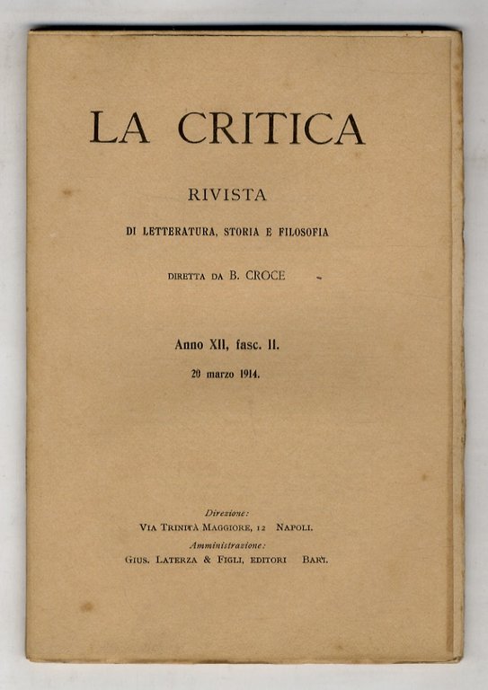 CRITICA (LA). Rivista di letteratura, storia e filosofia diretta da B. Croce. Anno XII, 1914, fasc. I [-VI]. [Annata completa].