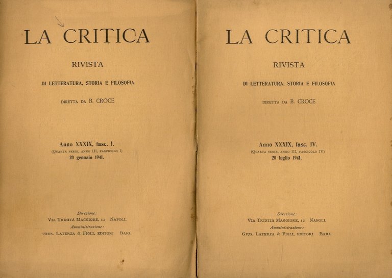 CRITICA (LA). Rivista di letteratura, storia e filosofia diretta da B. Croce. Volume XXXIX, 1941. Fascicoli I e IV.