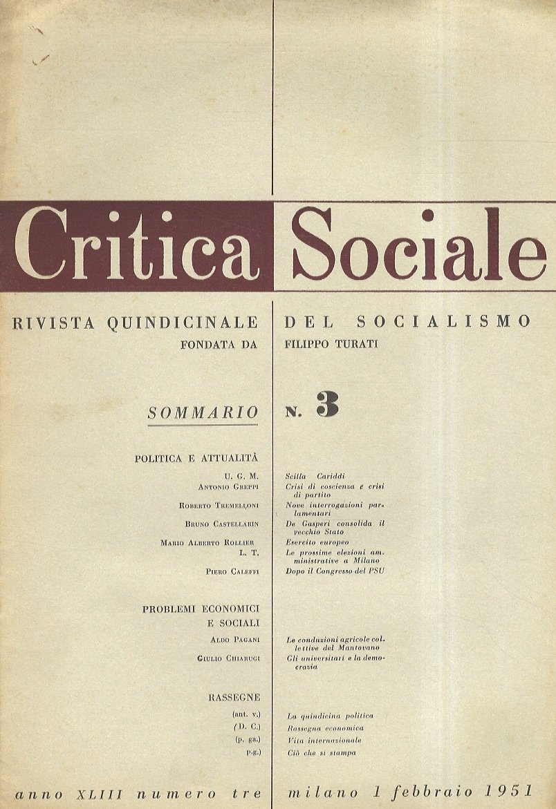 CRITICA Sociale. Rivista quindicinale del Socialismo, fondata da Filippo Turati. Anno XLIII numero 3, Milano, 1 febbraio 1951.