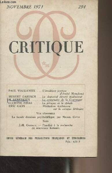 Critique, revue générale des publications françaises et étrangères n°294 Nov. 1971 - Paul Viallaneix : L'érudition joyeuse d'André Monglond - Hubert Damisch : Le dispositif dénoté traducteur - M. Reberioux : Le centenaire de la Commune - Lucette Finas : L