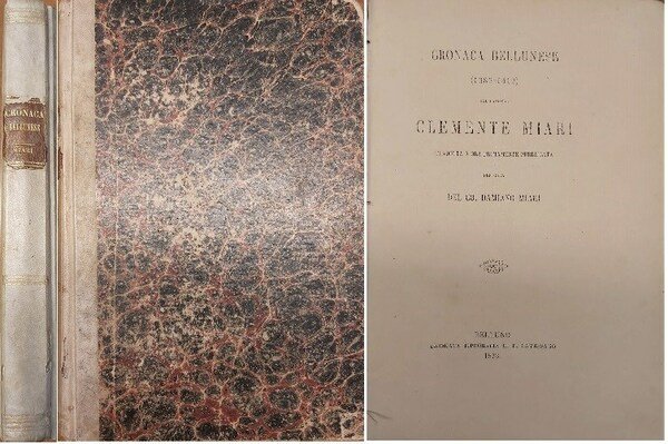 in-8, pp. X, 234, (2), leg. m. perg. coeva con tass. al d., piatti in cart. dec. Con una tabella ripiegata con l'albero genealogico e stemma arladico della nobile famiglia bellunese da Alessandro nel XIII sec. a Damiano nella prima metà dell'Ottocento. Vi è narrata la storia di Belluno trascritta da un antico codice custodito dalla famiglia Miari. Bell'esempl. [016]