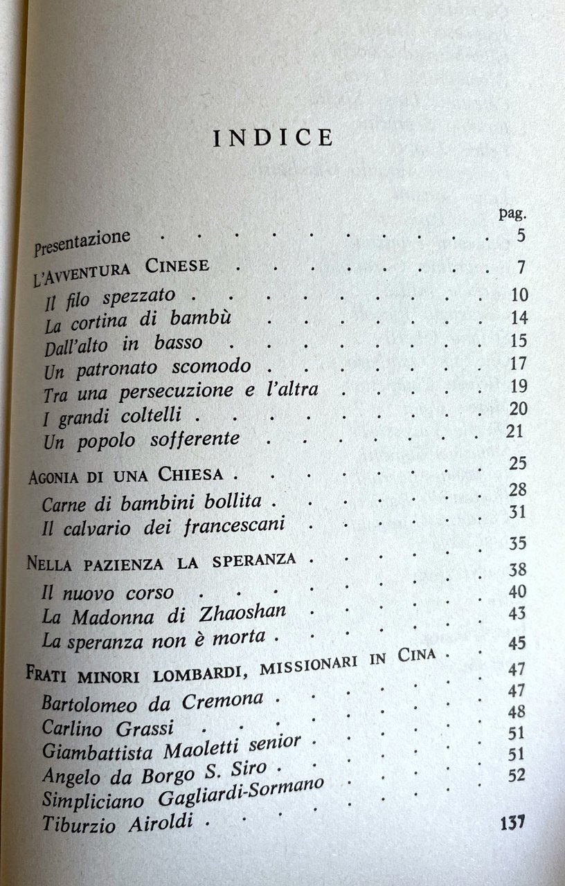 Soggetti: Sinologia Cina Missioni cristiane Evangelizzazione Monaci Monachesimo Biografie Memorie Martiri Esperienze Cristianesimo Vittime Persecuzioni Storia Racconti Bambù Patronato Persecuzione Coltelli Popolo Agonia Chiesa cattolica Carne bollita Calvario Madonna Zhaoshan Speranza Frati Minori Missionari Bartolomeo da Cremona Carlino Grassi Giambattista Maoletti Angelo da Borgo S. Siro Simpliciano Gagliardi-Sormano Tiburzio Airoldi Ermenegildo Nadasdi Pedracini Odoardo da Olate Magni Zucchi Torre Celestino Luigi Spelta Eusebio Semprini Felice Zoppi Antonio Giachetti Sorzani Stefano Pasinetti Franzoni Bernardino Garimoldi Michele Julitta Gaudenzio Piccoli Oberti Giuseppe Gambaro Chiapetta Comi Davide Vavassori Stanislao Comotti Innocente Burroni Ildebrando Ranieri Costanzo Giupponi Lino Agazzi Libri illustrati rari fuori catalogo Collezionismo Lombardia Beato Carcano da Milano Missione ecumenica Studi francescani Italiani Agiografia Francescanesimo Francesco d'Assisi Martirio Estero Viaggio Asia Africa Preti Oriente Etienne Ducornet Saverio Vangelo Cristo Impero Centro Confratelli gesuiti Fascino Teologia Vita cristiana Pensiero Inculturazione Comunione Modernità Discepoli Confucio Colonialismo Imperialismo Europa Governo Libertà religiosa Clandestina Cattolici Formazione Vescovi Bibliografia Riti Apostoli Attività religiose Autorità Benedetto XVI Buddhismo Cattolicesimo Celebrazione Chang'an Cinesi Clandestinità locale Civili Comunità Concilio Vaticano Confucianesimo Congregazioni Credenti Imperatore Dinastia Ming Diocesi Dottrina Fedeli Laici Gerarchica Gesù Gran khan imperiale Kangxi Associazione Patriottica Letterati Liturgia Manciù Mao Tze-Tung Zedong Matteo Ricci Nestorianesimo Occidentale Pastorale Pastori Pechino Politica Potere Protestanti Religione Repubblica Popolare Cinese Rituali Rivoluzione culturale Sacerdoti Santa Sede Seminaristi Cielo Stranieri Successore Pietro Taiwan Taoismo Testimonianza Yongzheng Marcellino da Civezza Wading Predicatori Marco Polo Cocincina Macao Spezie Guerre Guerra Manchu Mandarini Mongolia Tibet Tonchino Gabriele Allegra Andrea Riccardi Sichuan Partito Comunista Maoismo Paul Yu Bin Nanchin Vescovato Rivolta Boxer Oppio Metodisti Portoghesi Robert Morrison Charles Gützlaff Tang Filosofia Giovanni da Montecorvino Eluosi Propaganda Fide Ripa Italia Teodorico Pedrini Carlo Orazi Singan Fu Domenicani Parigi Agostiniani Caracciolini Carmelitani Xenofobia Qing Trattati ineguali Suore Scuole Orfanotrofi Bambini Ospedali Colture agricole Shanghai Franz Xaver Biallas Rerum Ecclesiae Gerolamo Fazzini Natale Sarmazia Tartari Mar Caspio Pellegrinaggio Mongoli Pian dei Caprini Karakorum Papi Ceylon Madras Giava Borneo Sumatra Canton Il Milione Infedeli Crociate Diplomazia Relazioni internazionali Resoconti Suffragio Boicottaggio Commercio Violenze Soprusi Formosa Birmania Hong Kong Fedeltà Giustizia Milizia Giappone Taiping Agenti Accuse Ideologie Comunismo Kiangsi Hunan Hupei Shansi Shantong Kirin Conversione Oriani Portogallo Francia Inghilterra Terz'Ordine Collegio Marxismo-leninismo Heng-yang Casini Bollettino Roger Etchegaray Melis Demarchi Pieraccini Riferimento Fonti storiche Notizie Acta ordinis Fratrum Sinology China Christian missions Evangelization Monks Monasticism Biographies Memoirs Martyrs Experiences Christianity Victims Persecutions History Stories Bamboo Patronage Persecution People Agony Catholic Church Boiled meat Calvary Hope Friars Minor Missionaries Rare illustrated books out of print Collectibles Blessed Ecumenical mission Franciscan studies Italians Hagiography Franciscanism Francis of Assisi Martyrdom Abroad Travel East Gospel Christ Empire Center Jesuit Brothers Fascination Theology Life Thought Inculturation Communion Modernity Disciples Confucius Colonialism Imperialism Europe Government Religious freedom Clandestine Catholics Formation Bishops Bibliography Rites Apostles Activities Authority Benedict Buddhism Catholicism Celebration Chinese Local clandestinity Civilians Community Vatican Council Confucianism Congregations Believers Emperor Dynasties Dioceses Doctrine Faithful Laymen Hierarchical Imperial Jesus Patriotic Association Literati Liturgy Nestorianism Western Pastoral Pastors Beijing Politics Power Protestants Religion People's Republic Rituals Cultural Revolution Priests Holy See Seminarians Heaven Foreigners Successor Peter Taoism Testimony Preachers Spices Wars War Mandarins Tonkin Communist Party Maoism Bishopric Revolt Opium Portuguese Methodists Philosophy Italy Dominicans Paris Augustinians Carmelites Xenophobia Unequal Treaties Nuns Schools Orphanages Children Hospitals Crops Sarmatia Tartars Caspian Sea Pilgrimage Mongols Popes Java Infidels Crusades Diplomacy International Relations Reports Suffrage Boycott Trade Violence Abuse Burma Loyalty Justice Militia Japan Agents Accusations Ideologies Communism Conversion Portugal France England Third Order College Marxism-Leninism Bulletin Reference Historical Sources News