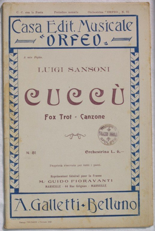 In 8. cm 27x18. Pp. 14. Partitura completa per orchestra del 1929 di una canzone. Caratteristica copertina decorata dell'epoca. Ex libris sulla copertina. Ottime condizioni. A complete score for orchestra of 1929. Carachteristic decorated cover of that period. Ex libris in the cover. Very good conditions.