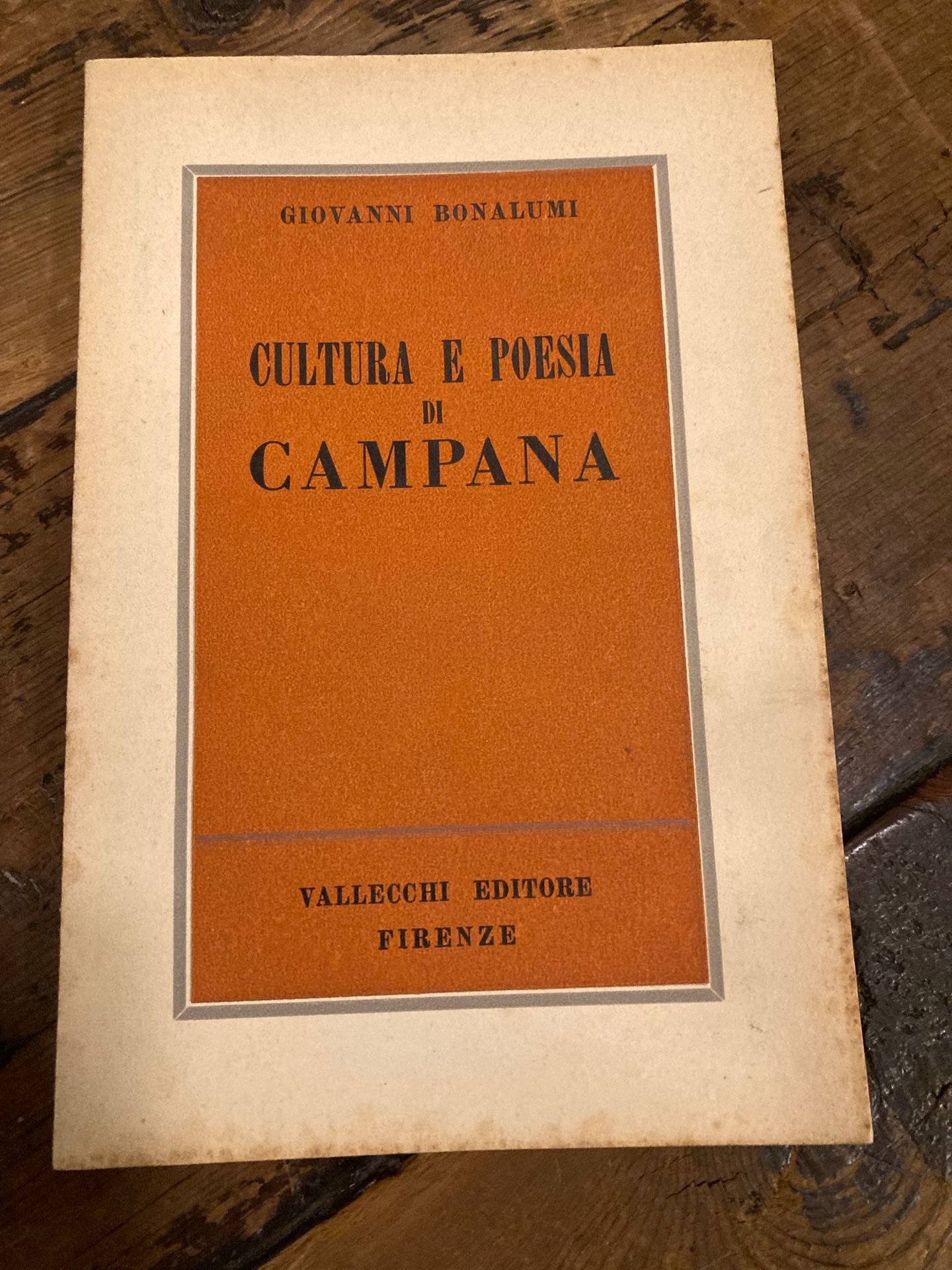 In-16° (18x12 cm), pp. 131 (5), brossura editoriale con titoli in nero in campo ocra. Ottimo esemplare conservante la scheda editoriale. Prima edizione di questo importante studio critico sulla figura e l'opera di Dino Campana uscito un anno dopo la quarta edizione dei Canti orfici curata da Falqui.