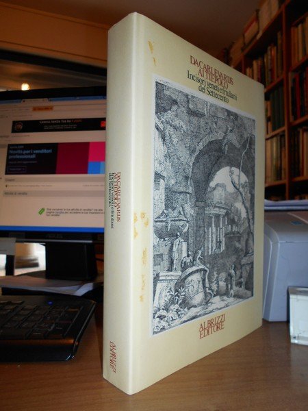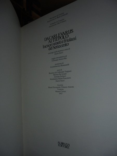 SUCCI DARIO (A CURA DI). Venezia, Albrizzi Editore, 1983. DA CARLEVARIJS AL TIEPOLO. INCISORI VENETI E FRIULANI del Settecento. In-4°, legatura editoriale in tela con titoli al dorso e al piatto anteriore e sovraccoperta illustrata, pp. 512-XXX . 678 tavole e ill.ni in b/n nel testo e f.t. Catalogo della mostra allestita a Gorizia, Musei Provinciali, Palazzo Attems e Venezia, Museo Correr, 1983. Prima edizione. Importante saggio sull'incisione del XVIII secolo a cura di Dario Succi con saggio introduttivo di Giuseppe Maria Pilo, premessa di Giandomenico Romanelli, testi di Beatrice di Colloredo Toppani, Marino De Grassi, Annalia Delneri, Maddalena Malni Pascoletti, Dario Succi. Il volume è in stato di nuovo. La sovracopertina presenta alcune lievi macchioline per contatto con altra sovracopertina (eliminata). Neg. mob. 7 dietro