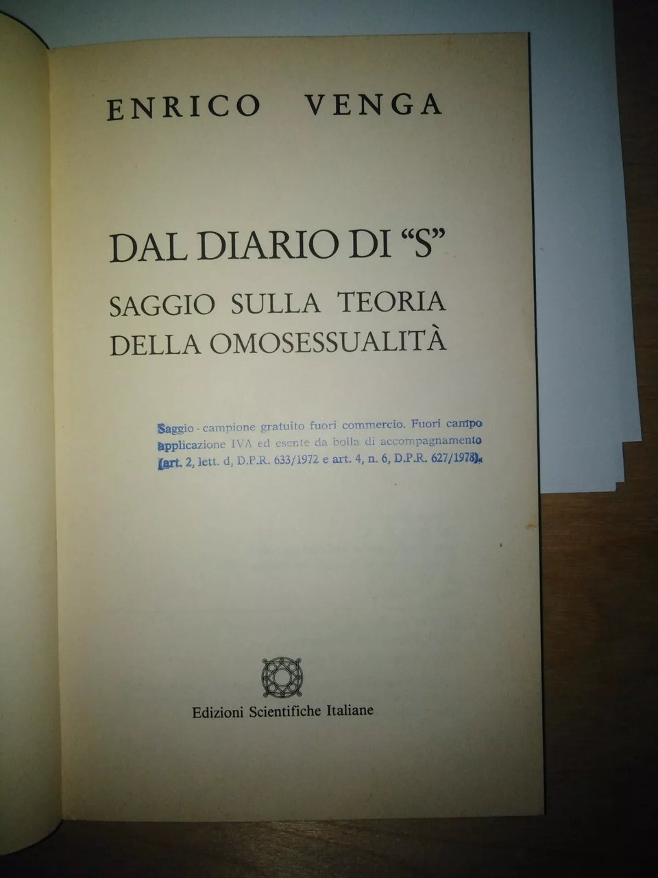 ENRICO VENGA, Dal diario di «S». Saggio sulla teoria dell'omosessualità - edizioni scientifiche italiane, 1989