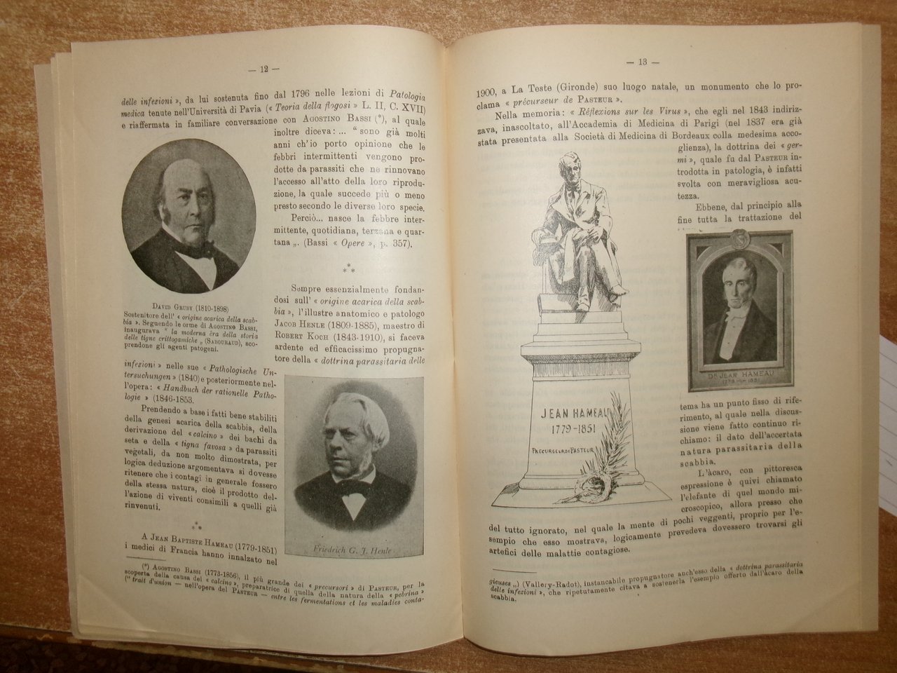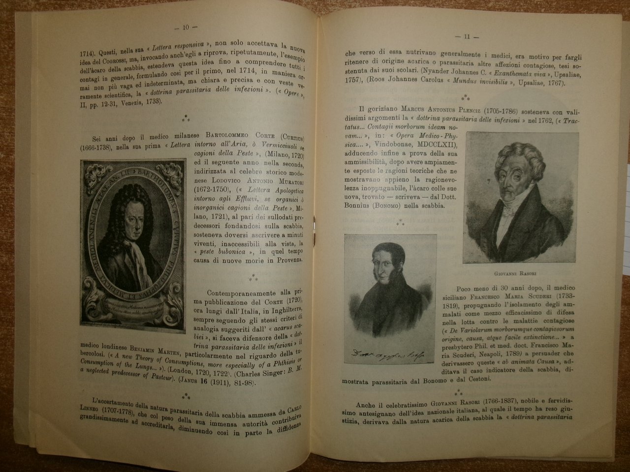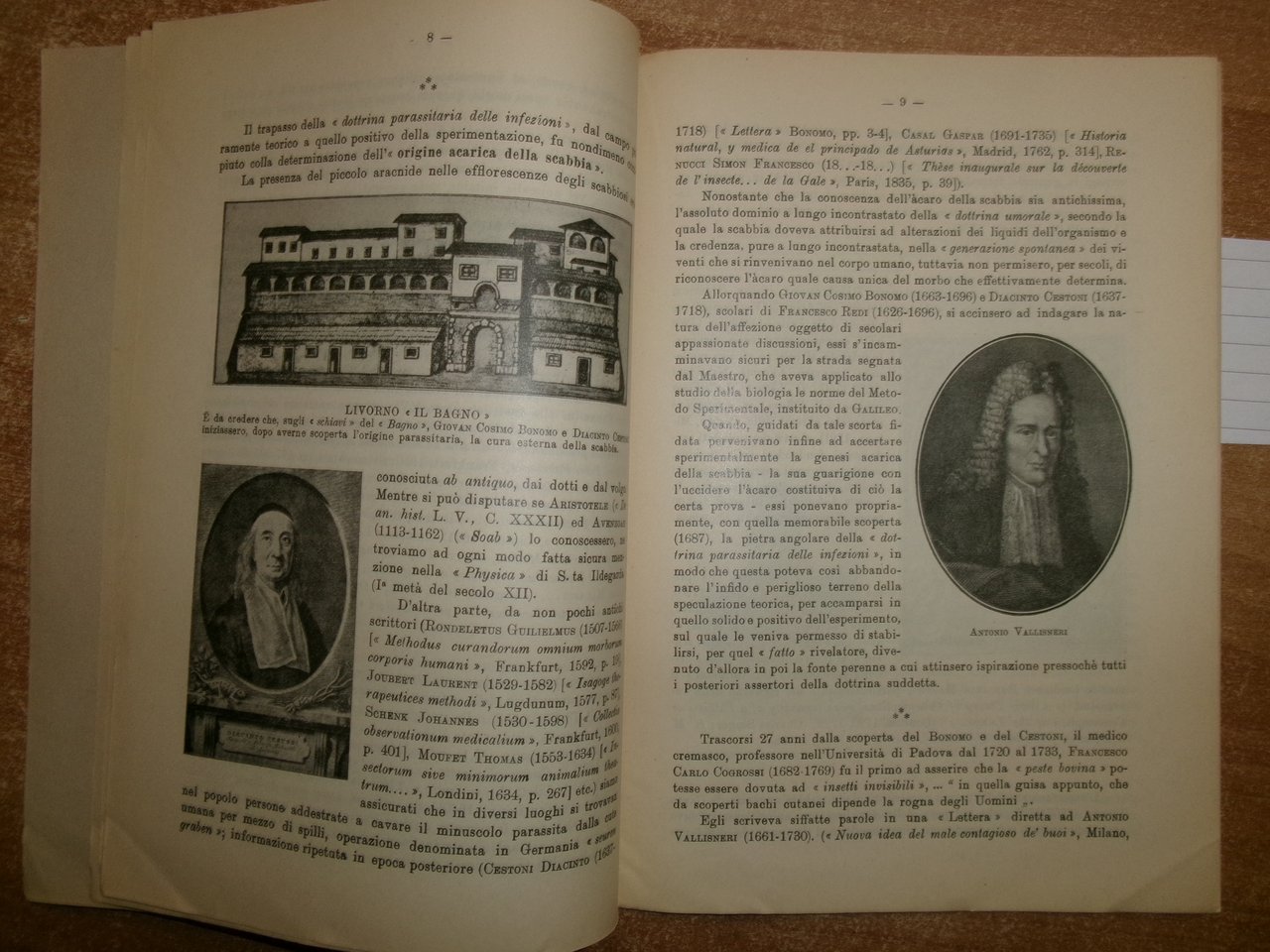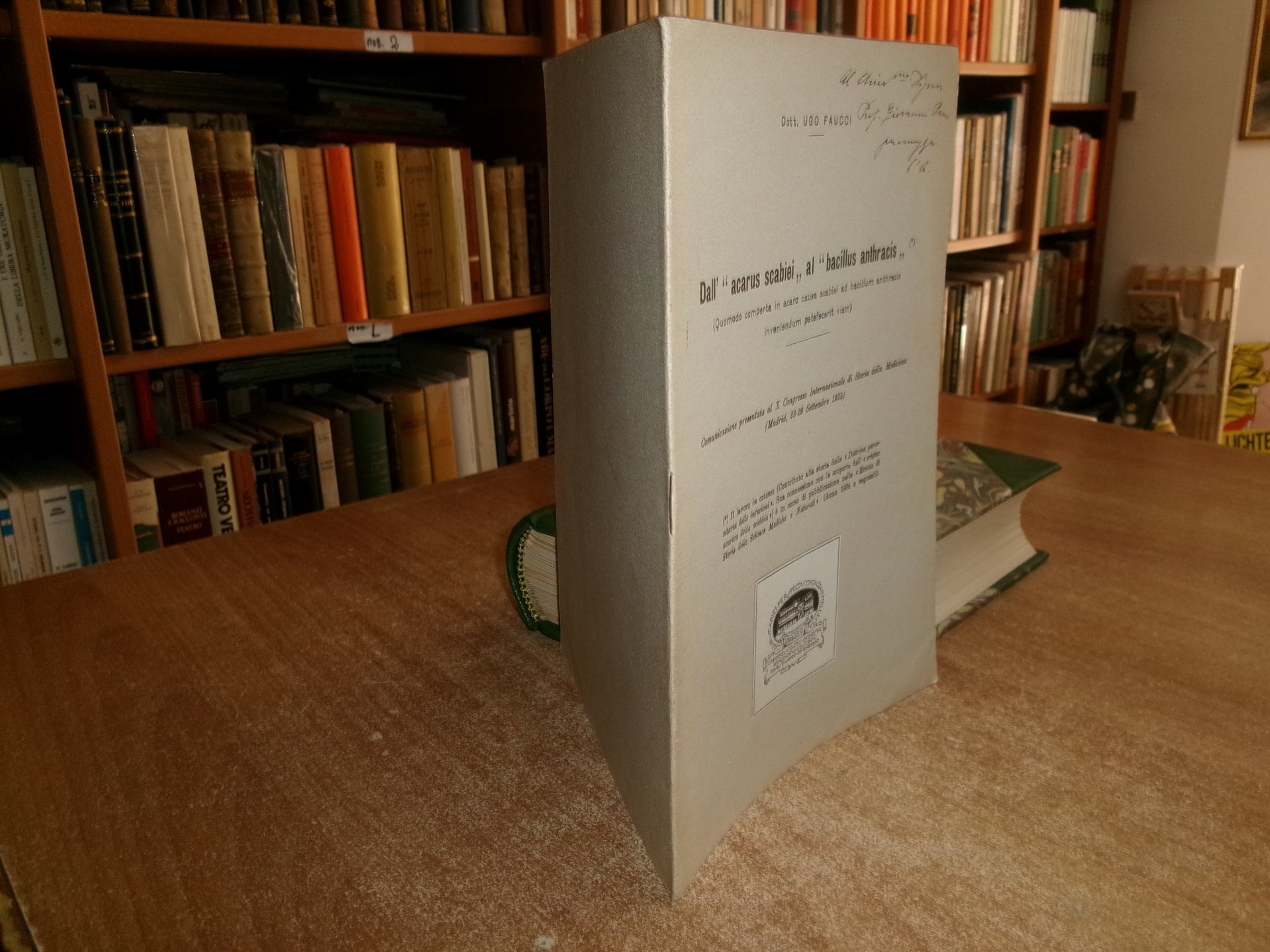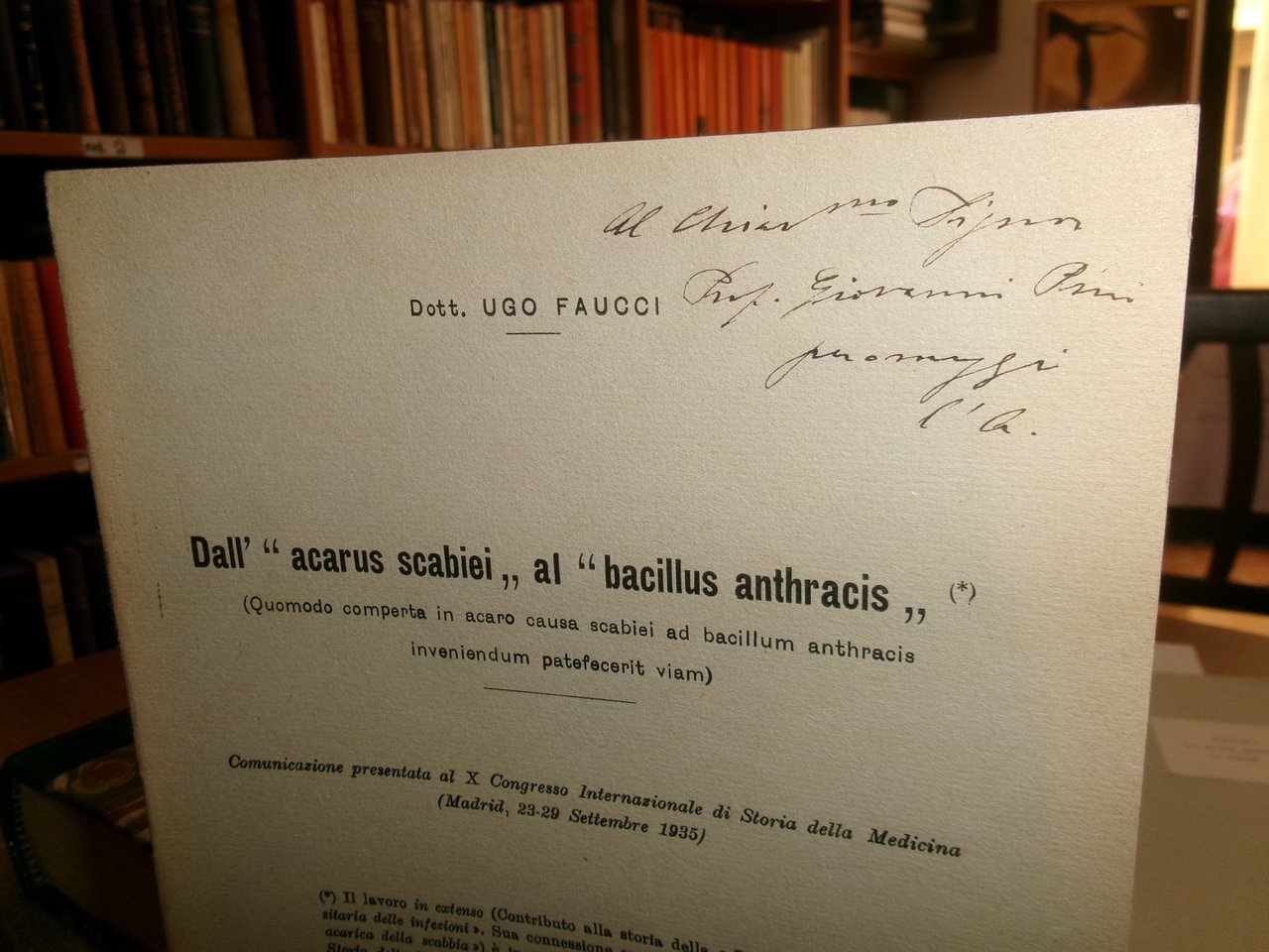 UGO FAUCCI. Madrid, 23-29 Settembre, 1935. Dall' "acarus scabiei" al "bacillus anthracis". (Quemodo comperta in acaro causa scabiei ad bacillum anthracis inveniendum patefecerit viam). In-8°, br. con punto metallico. 18 pp. con numerosi ritratti n.t. Raro opuscolo in ottimo stato con dedica a un professore da parte dell' autore (non firmata). Neg. lett. mod. mob. H entro busta trasp.