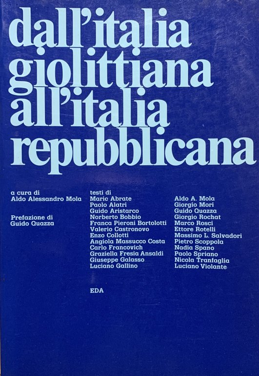 I ed. (1° marzo 1976). "Il Consiglio regionale del Piemonte, nel quadro delle manifestazioni indette per il 30° anniversario della lotta di liberazione e per il 25° anniversario della Costituzione repubblicana, promosse nel dicembre 1973 3 nel gennaio 1974 un corso di aggiornamento per insegnanti sul tema "Dall'Italia giolittiana all'Italia repubblicana". / L'iniziativa - che ebbe svolgimento nell'aula magna della Facoltà di Magistero dell'Università di Torino - fu organizzata con la collaborazione del Ministero della Pubblica Istruzione e fece registrare la presenza di circa 600 insegnangti piemontesi delle scuole medie inferiori e superiori (200 partecipanti e 400 uditori)" (dalla nota de La Presidenza del Consiglio Regionale del Piemonte, p. 3). Hanno collaborato al volumer Roberto Salvio e Carla Spagnuolo. VIII/ 466/ brossura patinata con grafica in blu/verde acqua. Stato buono. Indice: nota; La Presidenza del Consiglio Regionale del Piemonte - Prefazione; Guido Quazza - Nota introduttiva; A.A.M. - Guido Quazza; Introduzione al corso --- Mario Abrate; Società e Stato nell'età giolittiana: strutture economiche, forze sociali e lotta politica - Aldo Alessandro Mola; Dal colonialismo al nazionalismo: i problemi della partecipazione alla prima guerra mondiale - Paolo Spriano; Le conseguenze della prima guerra mondiale sulla situazione italiana: il "biennio rosso" - Paolo Alatri; Nascita ed avvento del fascismo - Luciano Violante; La crisi della legalità costituzionale nell'Italia prefascista. Gli stati d'assedio e i tribunali militari - nicola Tranfaglia; Stato e istituzioni nel regime fascista: appunti e ipotesi di ricerca - Pietro Scoppola; La Chiesa di fronte al fascismo - Giorgio Mori; Economia e politica economica durante il periodo fascista 1922-1939 - Carlo Francovich; Gli oppositori del fascismo all'interno e all'estero - Giorgio Rochat; Dal nazionalismo all'imperialismo: la politica estera italiana da Corfú alla guerra d'Abissinia e di Spagna (1923-1938) - Enzo Collotti; Dal patto d'acciaio al 25 luglio 1943: la situazione internazionale e l'atteggiamento delle forze economicje e sociali all'interno - Guido Quazza; La resistenza armata - Valerio Castronovo; Dalla liberazione alla Repubblica: partiti, sindacati e ricostruzione economica - Norberto Bobbio; Origine e caratteeri della Costituzione - Massimo Luigi Salvadori; La questione del Mezzogiorno - Angiola Massucco Costa; La questione meridionale - Franca Pieroni Bortolotti; La questione femminile in Italia dall'età giolittiana ad oggi - Nadia Spano; La questione femminile - Angiola Massucco Costa; La questione femminile - Graziella Fresia Ansaldi; Il neofemminismo - Ettore Rotelli; La questione delle autonomie locali - Giuseppe Galasso; I grandi problemi della società italiana nell'età repubblicana --- Guido Aristarco; Storiografia e documento cinematografico - Marco Rosci - La città nell'Italia contemporanea - Luciano Gallino; Storiografia e sociologia: il mutamento delle strutture di classe in Italia --- Epilogo (Guido Quazza; Alcune questioni fra didattica e politica) --- Bibliografia - Programma del corso - Indice dei nomi.