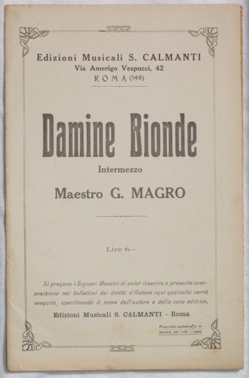 In 8. cm 26,5x17,5. Pp. 11. Partitura completa per orchestra senza data ma degli anni '30 di una canzone. Caratteristica copertina decorata dell'epoca. Ex libris sulla copertina. Ottime condizioni. A complete score for orchestra not dated but of 1930's. Carachteristic decorated cover of that period. Ex libris in the cover. Very good conditions.