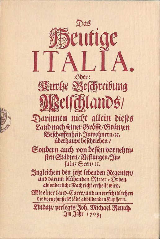 Reprint liberamente interpretato con testo a fronte dell'edizione Lindau 1703, testo in italiano e tedesco, 171 p., f.to cm 17,5x12, copertina flessibile con sovraccoperta e custodia, illustrazioni in b/n. Ottime condizioni.