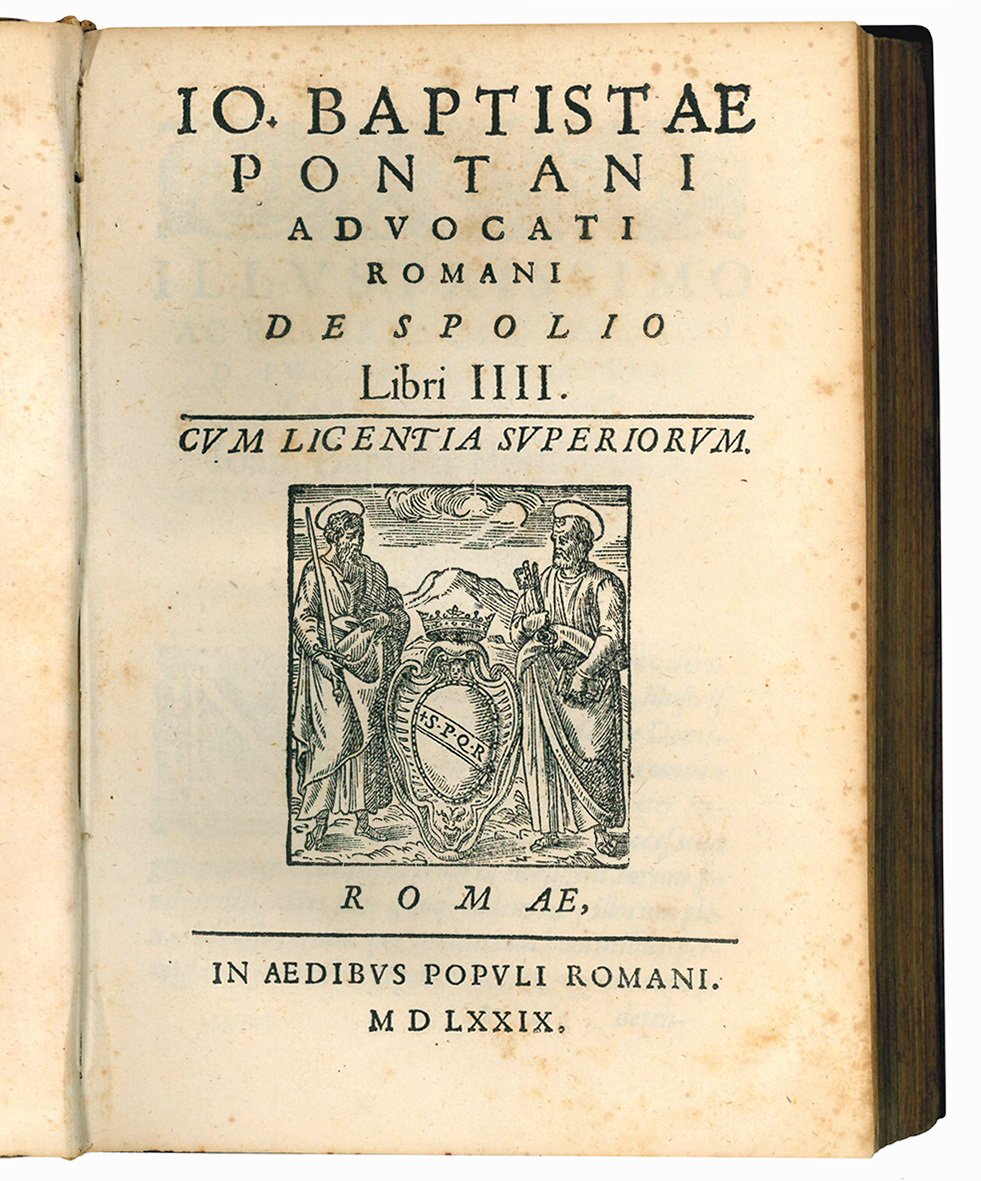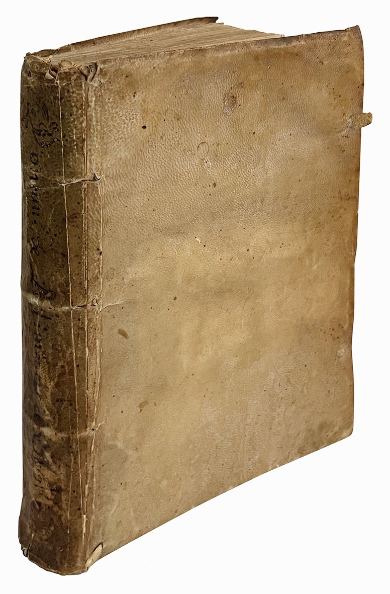 Due opere rilegate insieme in un volume in 4to (mm 210x144); cc. [4], 40, [18]; [4], 140, [48]. Segnatura: [stella]4 a-k4 A-C4 D6; †4 A-Mm4 a-m4. Pergamena floscia coeva con titolo manoscritto al dorso. Titolo manoscritto al taglio inferiore. Dorso un po' brunito. I) Marca editoriale xilografica al frontespizio; iniziali, frontalini e fregi xilografici. Lievi aloni e fioriture diffuse. Segni di tarlo ai margini di alcune carte. II) Marca editoriale xilografica al frontespizio, stemma xilografico di Roma sormontato da corona al termine. Iniziali, frontalini e fregi xilografici. Lievi aloni e fioriture diffuse. Segni di tarlo ai margini di alcune carte.
