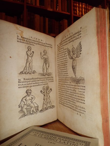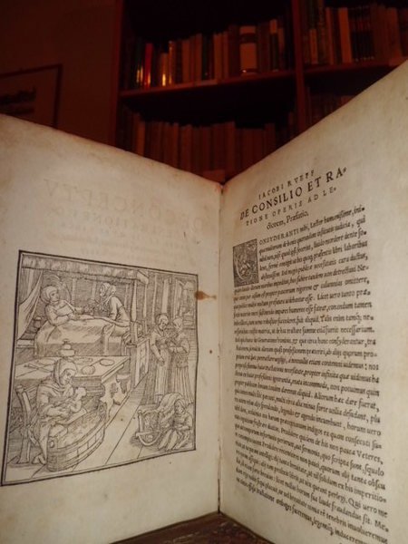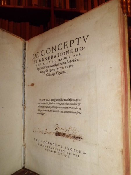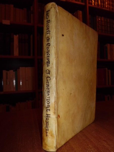 IN - 4°, PERGAMENA COEVA. (IV), 105 FF., 1 F. BIANCO. NUMEROSE FIGURE FINEMENTE INCISE IN LEGNO N.T. DELLE QUALI 7 A PIENA PAGINA RAFFIGURANTI I GENITALI FEMMINILI, UNA SEDIA OSTETRICA E STRUMENTI VARI PER IL PARTO. A PARTE LIEVI ARROSSATURE DELLA CARTA, DOVUTE A NORMALE PATINA DEL TEMPO, BELL' ESEMPLARE NEL SUO STATO ORIGINALE; ALCUNE SOTTOLINEATURE E NOTE MARGINALI DI MANO D' EPOCA. PRIMA EDIZIONE PUBBLICATA SIMULTANEAMENTE IN LATINO E IN TEDESCO DALLO STESSO STAMPATORE. JACOB RUEFF, FAMOSO LITOTOMO NATO NELLA RENANIA, SI STABILÌ A ZURIGO VERSO IL 1525. NEL 1552 FU NOMINATO MEDICO DI CITTÀ E NEL 1554 PUBBLICÒ LA PRIMA EDIZIONE DEL SUO DE CONCEPTU ET GENERATIONE HOMINIS, UNO DEI PRIMI CLASSICI DELLA LETTERATURA OSTETRICA. DIVERSAMENTE DAL ROSENGARTEN DI ROSSLIN QUEST' OPERA É BASATA QUASI INTERAMENTE SULLE OSSERVAZIONI DELL' AUTORE. RUEFF NON SOLO ERA UN ESPERTO CHIRURGO, LITOTOMO ED OSTETRICO, MA SI DISTINSE ANCHE COME ANATOMICO ED EMBRIOLOGO. "HIS WORK ORIGINALLY APPEARED IN BOTH LATIN AND GERMAN VERSIONS AND CONTRASTED FAVORABLY WITH ITS PREDECESSORS ON THE SAME SUBJECT, BOTH IN THE AMOUNT AND THE ACCURACY OF ITS INFORMATION AND IN ITS ILLUSTRATIONS. RUEFF'S TEXT COMPRISED SIX SECTIONS, OR BOOKS. THE FIRST DEALS WITH THE PHYSIOLOGY OF IMPREGNATION AND CONCEPTION AND WITH THE DEVELOPMENT AND NUTRITION OF THE FETUS. THE SECOND DESCRIBES THE UTERUS AND THE CONDITION OF THE FETUS WITHIN IT AND INCLUDES A CHAPTER OF NECESSARY PRECEPTS FOR PREGNANT WOMEN. BOOK 3 EXPLAINS PARTURITION, WITH RULES AND MEDICAMENTS FOR ALLEVIATING DELAY AND DIFFICULTY OF BIRTH AND FOR THE CARE OF THE MOTHER AND INFANT; IT HAS A CHAPTER ON OBSTETRIC INSTRUMENTS, SUCH AS THE SPECULUM AND BOTH SMOOTH AND TOOTHED FORCEPS FOR EXTRACTION OF A DEAD FETUS, WHICH ARE DISPLAYED IN CLEAR WOODCUTS. BOOK 4 TEACHES THE MENAGEMENT OF FIFTEN FORMS OF UNNATURAL BIRTH (INCLUDING THE DELIVERY OF AWKWARD PRESENTATIONS AND TWINS), EACH ILLUSTRATED BY TRADITIONAL BIRTH FIGURES IN WHICH THE FETUS LOOKS LIKE A GROWN CHILD, ALTHOUGH THE ARTIST HAS ADDED MORE ANATOMIC DETAIL THAN IS SHOWN IN EARLIER DRAWINGS. BOOK 5 DISCUSSES FALSE CONCEPTIONS, TUMORS OF THE ETERUS, PHYSICALLY DEFECTIVE INFANTS AND MONSTERS, ABORTION AND ITS TREATMENT, AND THE SIGNS OF CONCEPTION. BOOK 6 SUGGEST THE CAUSE OF STERILITY AND DESCRIBES THE PRINCIPAL DISEASES OF THE UTERUS, ONCE AGAIN OFFERING PRESCRIPTION FOR APPROPRIATE REMEDIES. RUEFF'S BOOK KEPT ITS USEFULNESS FOR NEARLY A CENTURY AND WAS OFTEN REPRINTED" (LEFANU, NOTABLE MEDICAL BOOKS FROM THE LILLY LIBRARY, P. 35). HIRSCH, BIOGRAPHISHES LEXICON DER HERVORRAGENDEN AERZTE, IV, P. 914. GARRISON & MORTON, MEDICAL BIBLIOGRAPHY, 453, 6141. DURLING, SIXTEENTH CENTURY PRINTED BOOKS IN THE NATIONAL LIBRARY OF MEDICINE, 3980. WELLCOME HISTORICAL MEDICAL LIBRARY, CATALOGUE OF PRINTED BOOKS, I, 5611. SALLANDER, BIBLIOTHECA WALLERIANA, 8301. NORMAN LIBRARY OF SCIENCE AND MEDICINE, 1856. REYNOLDS HISTORICAL LIBRARY, 3637. HELLMAN, A COLLECTION OF OBSTETRICAL BOOKS, 29. FASBENDER, GESCHICHTE DER GEBURTSHULFE, PP. 122 - 24. SIEBOLD, HISTORIE DE L' OBSTETRICIE, II, PP. 3 - 30. CUTTER & VIETS, A SHORT HISTORY OF MIDWIFERY, PP. 44, 188, 90. CIANFRANI, A SHORT HISTORY OF OBSTETRICS AND GYNECILOGY, PP. 144 - 45. NEEDHAM, HISTORY OF EMBRYOLOGY, PP. 111 - 12. UN CLASSICO DELLA LETTERATURA GINECOLOGICA. NON VENDIBILE ALL' ESTERO.