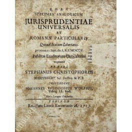 De iure civili dissertationes varie. Stephanus Christophorus Harpprecht: Specimen Analogicum Jurisprudentiae universalis, et Romanae particularis quoad statum Libertatis; UNITO A: Christiani Thomasii: Dissertatio inauguralis de De Usu Iuris paterni Romamorum secundum mores Germania, et Ius Borussicum revisum; UNITO A: Polycarpo Friderico Schachero: Iustinianum Manumissionum Fautorem; UNITO A: Ioh. Augusto Neubero: De Fure nocturno impune occidendo; UNITO A: Andreas Rinder: Dissertatio philosophica de Contractibus qui Aleam continent ad Pufendorfij de officio hominis et Civis Lib. I Cap. XV; UNITO A: Christian Gottlob Weber: Dissertatio Juridica de Variis causarum Figuris ad Leg. 1 FF de O et A; UNITO A: Daniel Christoph Ciese: Dissertatio