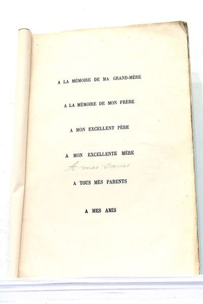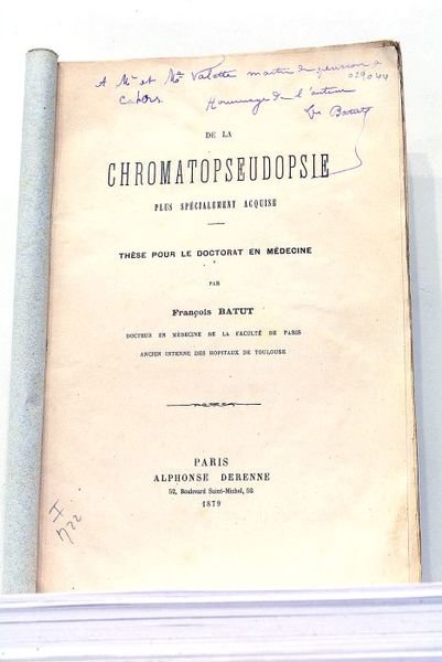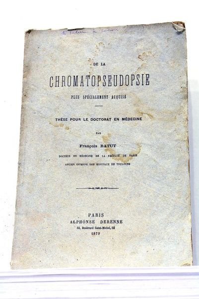grand in-8. 65pp. Broché, couverture imprimée avec manque de papier au plat inférieur et des mouillures au plat supérieur. Papier légèrement bruni. Feuillets un peu écornés. Première édition. Intéressante dissertation sur une affection, appellée également "Dyschromatopsie", consistant en la confusion des couleurs ou en une perception incomplète des couleurs (perception du blanc et du noir seulement). Envoi autographe de l'auteur. Ophtalmologie. Optique.