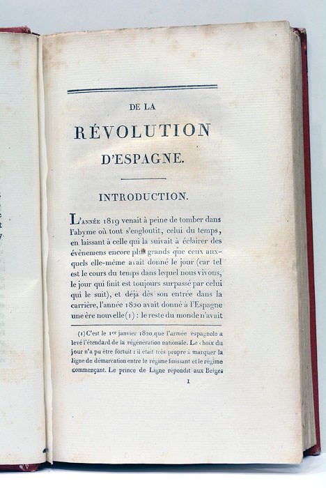 1 feuillet blanc. XIV. 222 pages. 1 feuillet. (22x13,5 Cm). Reliure postèrieur cartonnage rouge. Dos lisse. Titre et auteur doré. Plats legèrement frottés. Coins emousssés. Rousseurs. Texte sur la guerre de l'indépendance Espagnole. "Regarder en arrière serait exciter la défiance; et quels malheurs, Grand Dieu ! N'a-t-elle pas déjà produits dans sa propre famille…. , votre intéret commun est de ne plus vous séparer."….