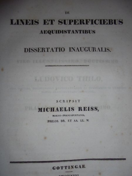 Michaelis, Reiss (1805 - 1869). Gottingae, 1826. De lineis et superficiebus aequidistantibus dissertatio inaguralis. In - 8° grande, cop. muta recente. 41, (2) pp. (addenda) con una tavola ripiegata f.t. in fine. Unknown to Poggendorff. Opuscolo ben conservato. Neg. sotto esot.