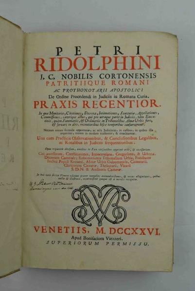 Cm. 34, pp. (8) 631 (1). Frontespizio in rosso e nero, alcune testate, capolettera e finalini in xilografia, testo su due colonne. Bella legatura coeva in piena perg. rigida, dorso a 5 nervi con tit. ms. Qualche arrossatura dovuta alla qualità della carta, peraltro ottimo esemplare. Fortunatissima opera di taglio procedurale del giureconsulto seicentesco originario di Cortona. L'elemento che contraddistingue questo testo risiede nel tentativo di delineare un vero e proprio manuale di procedura attraverso l'accostamento di decisioni, dottrina ed atti processuali. Nel panorama sei-settecentesco che vede proliferare le iniziative editoriali relative alle sole decisiones, quest'approccio assai originale e proteso alla "reductio ad unum" determinò numerose ristampe e grande circolazione. Importante. Non in Sapori.