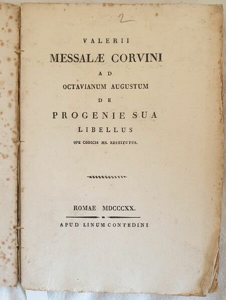 Edizione del 1820 di questa opera del militare e scrittore romano Marco Valerio Messalla Corvino. Opera a cura di Raffaele Mecenate (firma in calce a pag. 6). Esemplare numerato 39 su 52 esemplari stampati su carta pregiata. In buone condizioni e completo. Copertina assente, presente solo il piatto posteriore. Legatura in buone condizioni. All'interno le pagine si presentano in buone condizioni con fioriture.In barbe. In 8. Dim. 22x15,5 cm. Pp. 76+(2). Edition of 1820 of this work by the roman military and soldier Marco Valerio Messalla Corvino. Work cared by Raffaele Mecenate (signature in the end of pag. 6). Copy number 39 on 52 copies published on precious paper. In good conditions and complete. Cover lacks, there is only the back plate. Binding in good conditions. Pages in good conditions with foxing. Uncut copy. In 8. Dim. 22x15,5 cm. Pp. 76+(2).