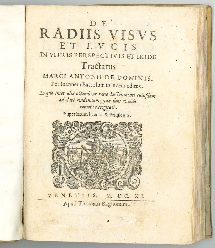 Very rare first edition, edited by De Dominis's friend Giovanni Bartoli and by him dedicated to the marquis Giovanni Battista del Monte Santa Maria, of this early work on the telescope and the operation of lenses, which also contains, in the second part, a full correct explanation of the phenomenon of the rainbow.