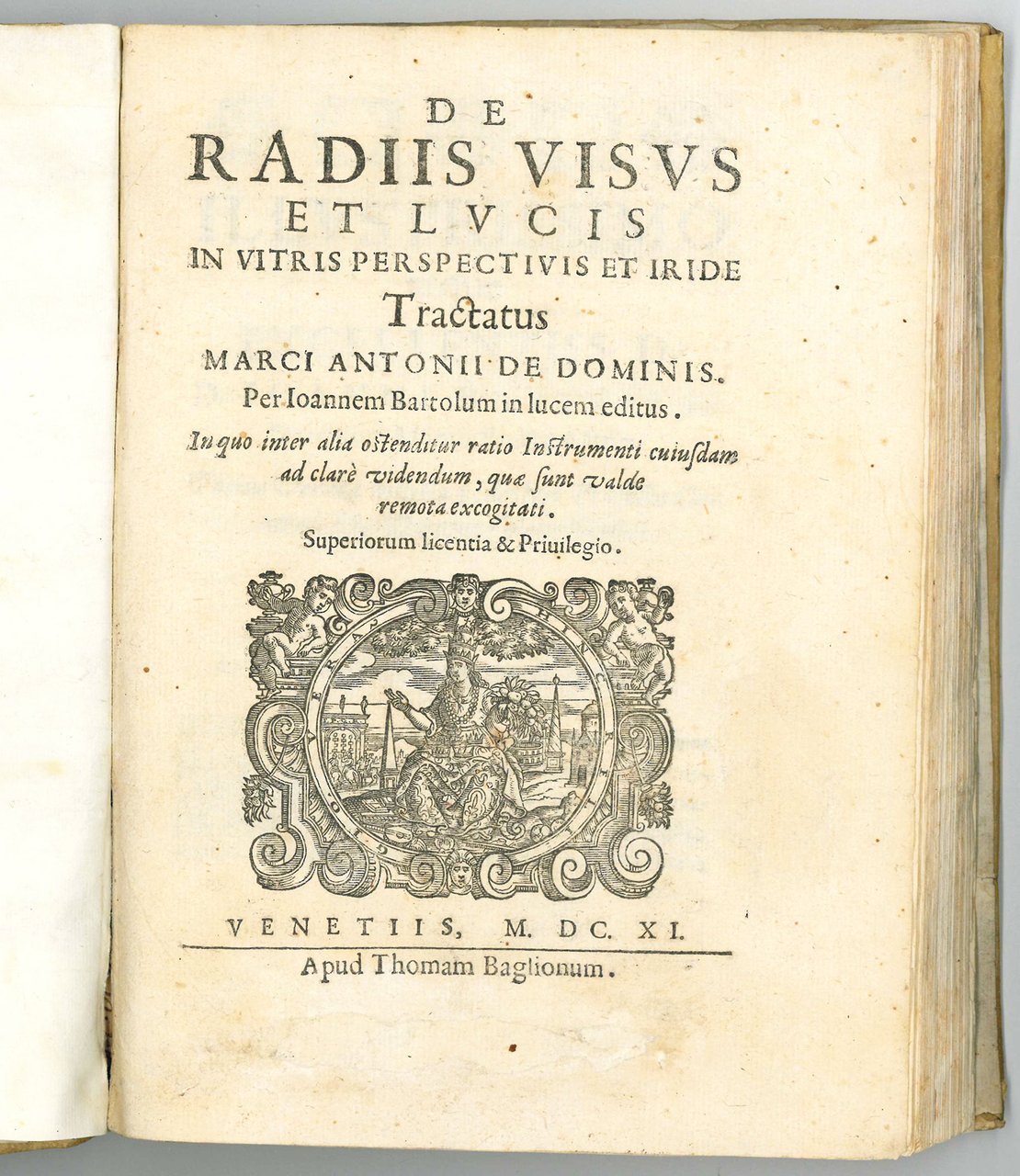 De radiis visus et lucis in vitris perspectivis et iride tractatus Marci Antonii De Dominis. Per Ioannem Bartolum in lucem editus. In quo inter alia ostenditur ratio instrumenti cuiusdam ad clare videndum, quae sunt valde remota excogitati