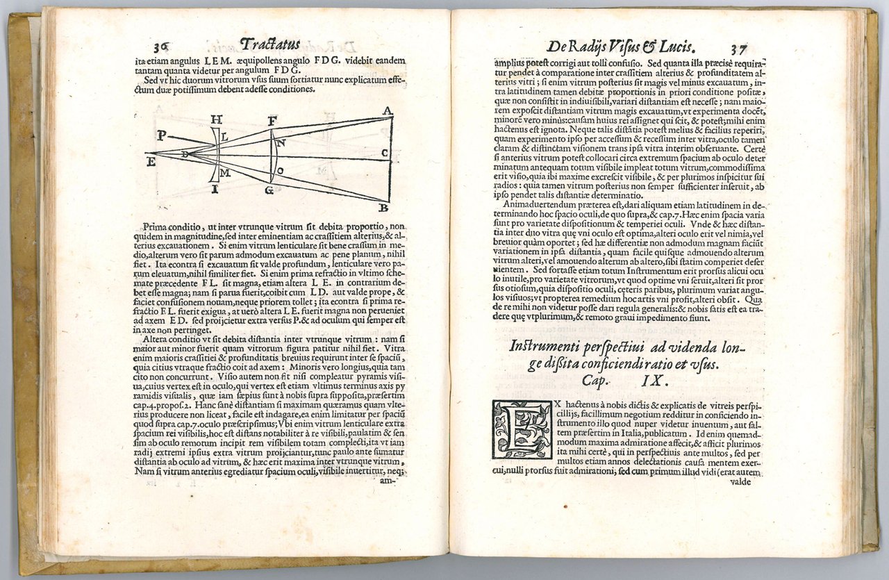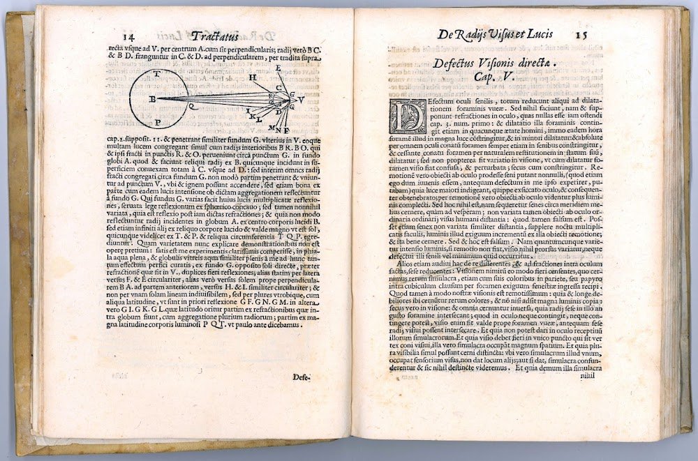 “In the preface, Bartolo says that the work is based on notes prepared by De Dominis for his lectures at Padua and Brescia twenty years before; but he adds that De Dominis himself had revised these notes and inserted an explanation of the newly-invented telescope […] Bartolo implies that De Dominis was acquainted very early with the principle of the telescope: ‘Non eram nescius eum in iuventute omnes publice professum fuisse partes Philosophiae, ac proinde etiam Mathematicis rebus splendorem maximum addidisse; sciscitari saepius placuit, quidnam de novo Instrumento illo sentiret, quod nuper ad inspicienda quae sunt remotissima a Nostrate Viro insigni Mathematico Galileo in lucem editum ferebatur, et Venetiis potissimum publicatum' [‘I was not unaware that in his youth he had publicly professed all the branches of philosophy, and consequently that he had added great splendor to mathematical studies; it often pleased him to inquire what he thought of that new instrument, which had lately been brought to light by our distinguished mathematician Galileo for the inspection of the remotest things, and especially published at Venice']. De Dominis also remarks: ‘Id enim quemadmodum maxima admiratione affecit, et afficit plurimos ita mihi certe, qui in perspectivis ante multos, sed per multos etiam annos delectationis causa mentem exercui, nulli prorsus fuit admirationi, sed cum primum illud vidi (erat autem valde imperfectum) effectum duorum vitrorum aperte cognovi' [‘As this truly caused great wonder, and affects most people, so certainly it did to me, who had exercised my mind in the art of perspective before many and indeed also for many years for my pleasure, it was not at all surprising to anyone, and indeed when I saw it for the first time (and it was very imperfect) I clearly understood the effect of the two glasses'], De radiis visus, pp. 37-38” (Ockenden, op. cit., p. 42, text and note 6).
