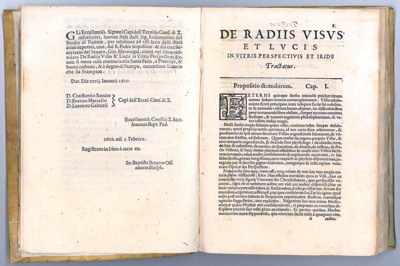 As a matter of fact De Dominis and Galileo were both teaching mathematics and physics in Padua around the same time and, even though it can't be proved, it is highly probable that they knew each other personally or at least each other's works. De Dominis' De radiis and Galileo's Sidereus nuncius were both published at a year's distance by the same printer, Tommaso Baglioni. The imprimatur of the De radiis, dated 3 February 1610, is signed by Giovanni Battista Breatto, the same who a few weeks later (8 March) also signed the printing license of the Sidereus. The reason why the publication of the De radiis was delayed by over a year (Bartoli's dedication to Del Monte is dated 1 October 1611) is unknown, but the fact that in its imprimatur it is recorded as a book of 69 pages (“Registrato in libro à Carte 69”) rather than the published 78, seems to suggest that De Dominis felt the need to update and increase the text after the publication of the Sidereus nuncius.