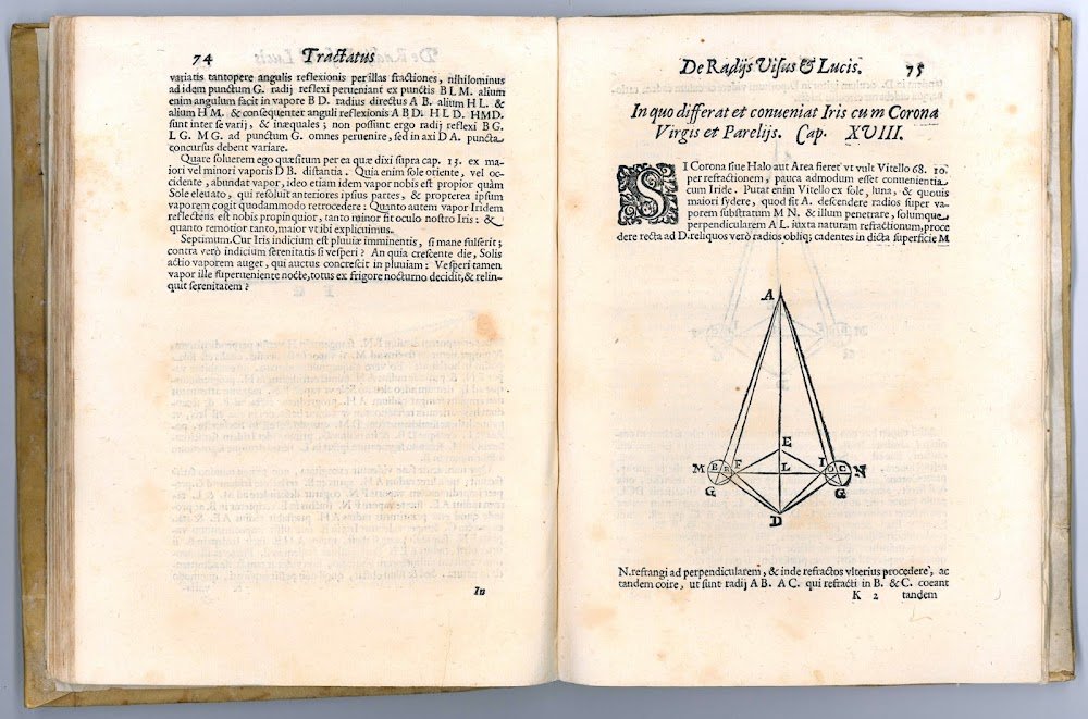 “De radiis visus et lucis deals with lenses, telescopes, and the rainbow. Dominis knew how light was refracted in its passage from one medium to another, but he was not always consistent in his assertions. He held that it was possible that in some cases light could pass through the border of a medium without being refracted -for instance, into a thin layer of water. In general, his observations on refraction in