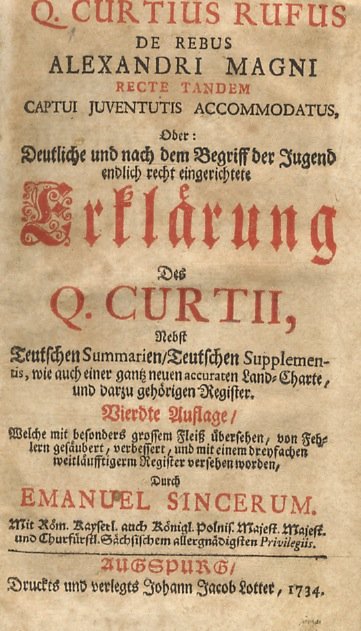 De rebus Alexandri Magni recte tandem captui juventutis accomodatus, Oder: Deutliche und nach dem Begriff der Jugend endlich recht eingerichtete Erklärung Des Quinti Curtii [.] Vierdte Auflage [.] durch Emanuel Sincerum [i.e. Esaias Schneider].