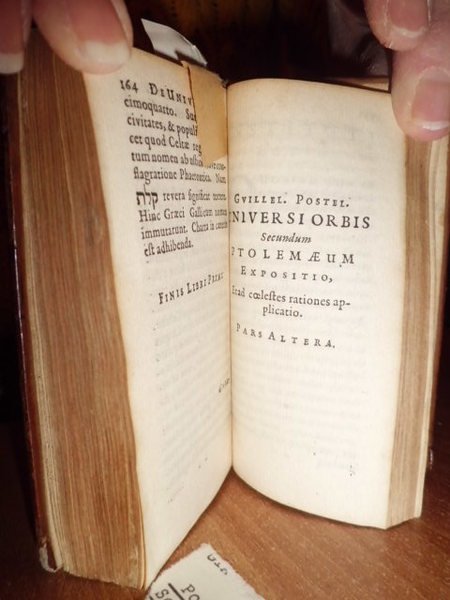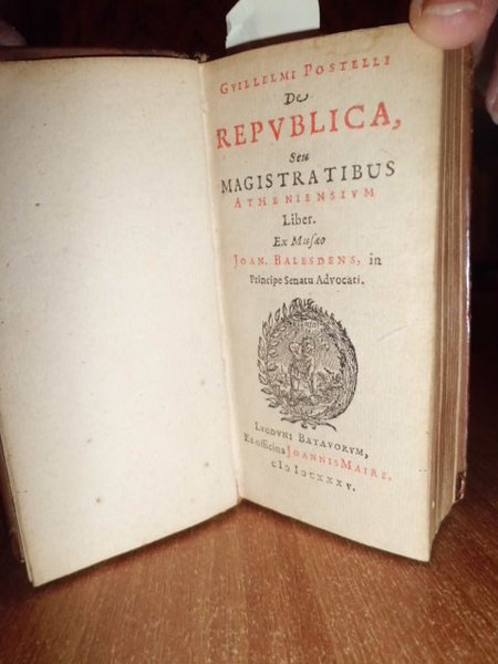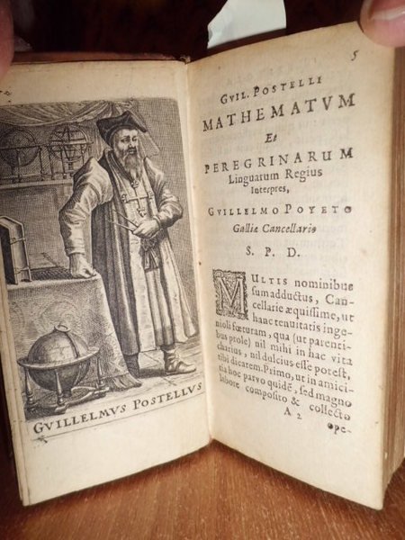 Postel, Guillaume. De Republica, seu Magistratibus atheniensium liber. Ex Musaeo Joan Balesdens, in principe Senatu advocati. Lugduni Batavorum, in officine Joannes Maire, 1635. (Unito:) Postel Guillaume. De Universitate libri duo: in quibus astronomiae, doctrinae ve coelestis compendium. Editio tertia. Lugduni Batavorum, ex officine Joannis Maire, 1635. 2 volumi in - 16° legati assieme in piena pelle coeva, dorso a nervi, piani con riquadri decorati in oro. 232, (6) pp., 1 f. bianco, ritratto dell' autore inciso in rame applicato al verso del frontespizio della prima opera; 261 pp., 1 f. bianco. Frontespizi stampati in rosso e nero. Rara edizione minuscola di opere cinquecentine. La seconda è citata dal Poggendorff, IV, 508; e dal Lande, Bibl. astronomique, p. 206. Il Postel (1510 - 1585), fu professore di lingue orientali e di matematica al College de France in Parigi.