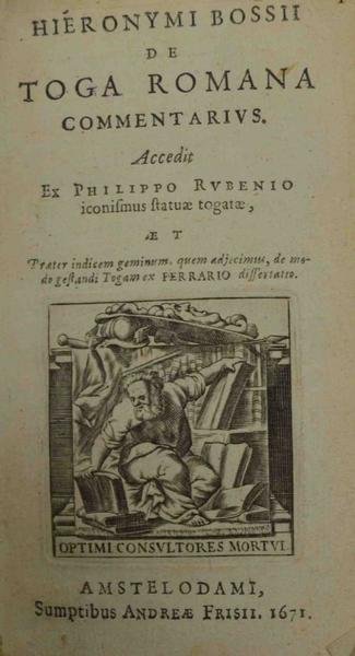Cm. 12,7, pp. 84 (12). Con una tavola incisa in rame e ripiegata fuori testo. Leg. del tempo in pergamena semirigida. Una antica firma rimossa al margine superiore bianco del frontespizio. Buona conservazione. Opera monografica, non comune, sulla toga romana.