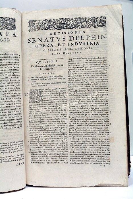 2 feuillets. 595 pages. 18 feuillets. 74 pages. (1 feuillet blanc.). 2 feuillets. (36 x 21,5 Cm). Plein veau, dos à nerfs orné. Reliure de l'époque en mauvais état, épidermures, éraflures, mors fendus, manques aux coiffes, aux coins et aux coupes, mouillures, gardes défraîchies. Rousseurs. Guy Pape, un des plus grands jurisconsultes français, né à Saint-Symphorien prés de Lyon. Membre du conseil Delphinal en 1440, maitre des requêtes, il fut appelé lors de la création du Parlement du Dauphiné pour y siéger comme conseiller. Texte en deux colonnes. Page de titre imprimée en rouge et noir avec un joli bois gravé. Fort volume qui mériterait une restauration.