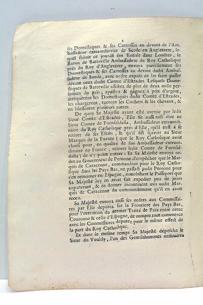 DECLARATION DE L'ESPAGNE POUR LA PRESSEANCE DES ROYS DE FRANCE. Procez verbal contenant la Déclaration que le Marquis de la Fuente, Ambassadeur extraordinaire du Roy catholique près du Roy, a faite à Sa Majesté de la part de son Maistre, pour satisfaire Sa Majesté sur ce qui estoit arrivé en la Ville de Londres le dixième octobre de l'année dernière 1661 entre les Ambassadeurs de France et d'Espagne: ensemble tout ce qui s'est passé dans cette première Audience.