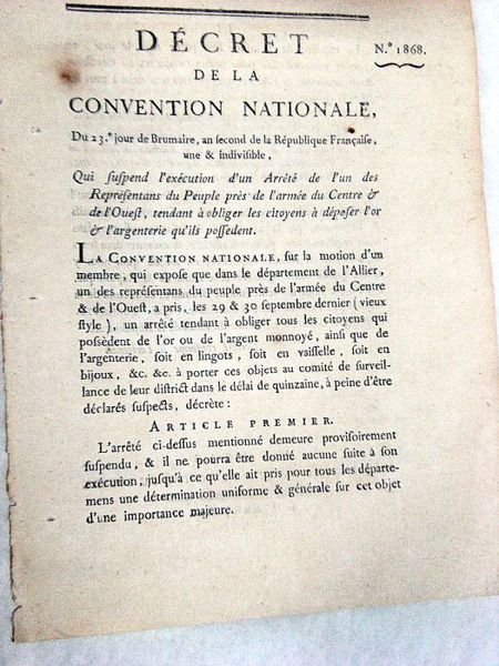 DÉCRET DE LA CONVENTION NATIONALE, du 23e jour de Brumaire, an second de la République française, une et indivisible, qui suspend l'exécution d'un arrêté de l'un des représentans du Peuple près de l'armée du Centre et de l'Ouest, tendant à obliger les citoyens à déposer l'or et l'argenterie qu'ils possèdent.