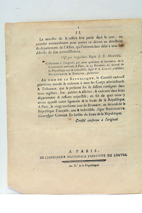 2 pages. (24x18 Cm). Broché. Petites rousseurs. Curieux document prévoyant l'annulation d'un arrêt pris dans l'Allier sur l'obligation des citoyens de donner l'or et l'argenterie qu'ils possèdent à l'État.