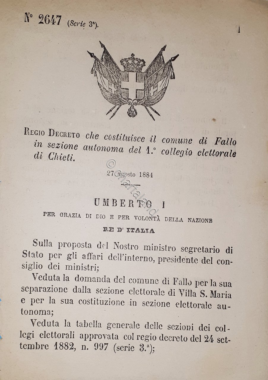 Regio Decreto che costituisce il comune di Fallo in sezione autonoma del 1^ collegio elettorale di Chieti. Decreto № 2647 Pagine - 2 27 Agosto 1884 Condizioni buone come da foto