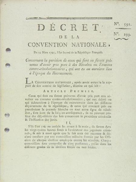 Décrets n° 591 et 299 de la Convention Nationale, du 19 mars 1793, l’an second de la République Française. CONCERNANT LA PUNITION de ceux qui sont ou seront prévenus d’avoir pris part à des Révoltes ou Emeutes contre-révolutionnaires, qui ont eu ou auroient lieu à l’époque du Recrutement.