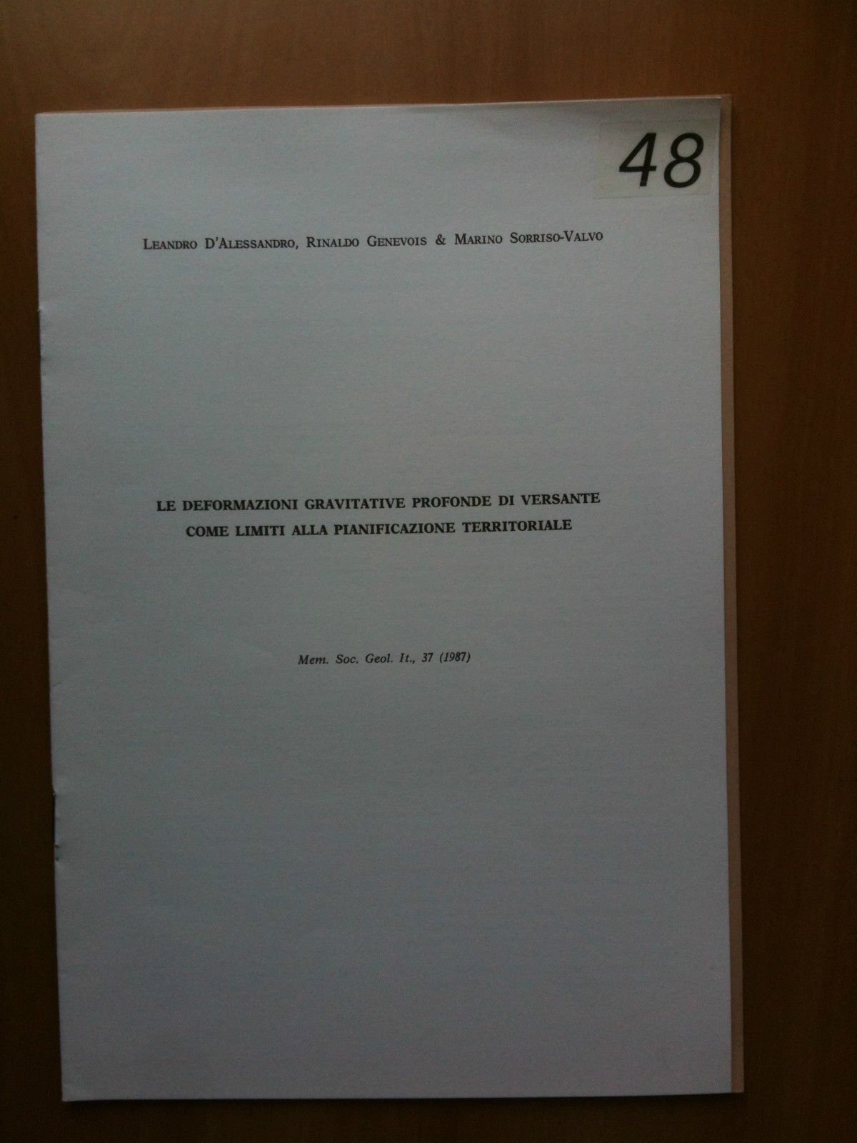 LE DEFORMAZIONI GRAVITATIVE PROFONDE DI VERSANTE COME LIMITI ALLA PIANIFICAZIONE TERRITORIALELeandro D'Alessandro, Rinaldo Genevois & Marino Sorriso-ValvoMem. Soc. Geol. It., 37 (1987)8 pagine Formato 17,5x26(27 g)E3460