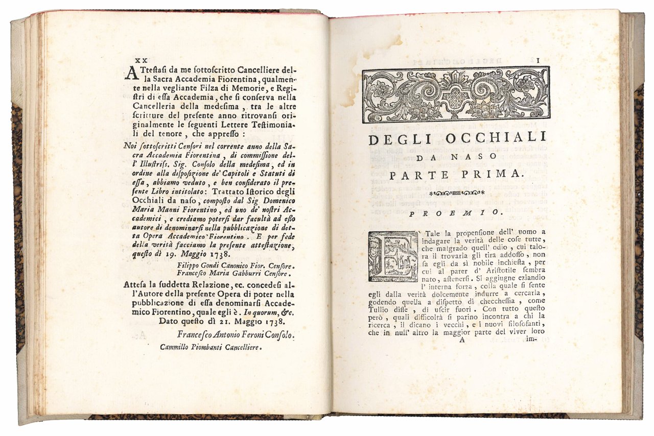 First edition, first issue with XX preliminary leaves and without the half title which was added later, of “the first book on the history of spectacles. Manni gave credit for the invention to the Florentine Armati (fl. 1300)” (Garrison-Morton). The work was reprinted at Florence in 1997 in a facsimile edition.
