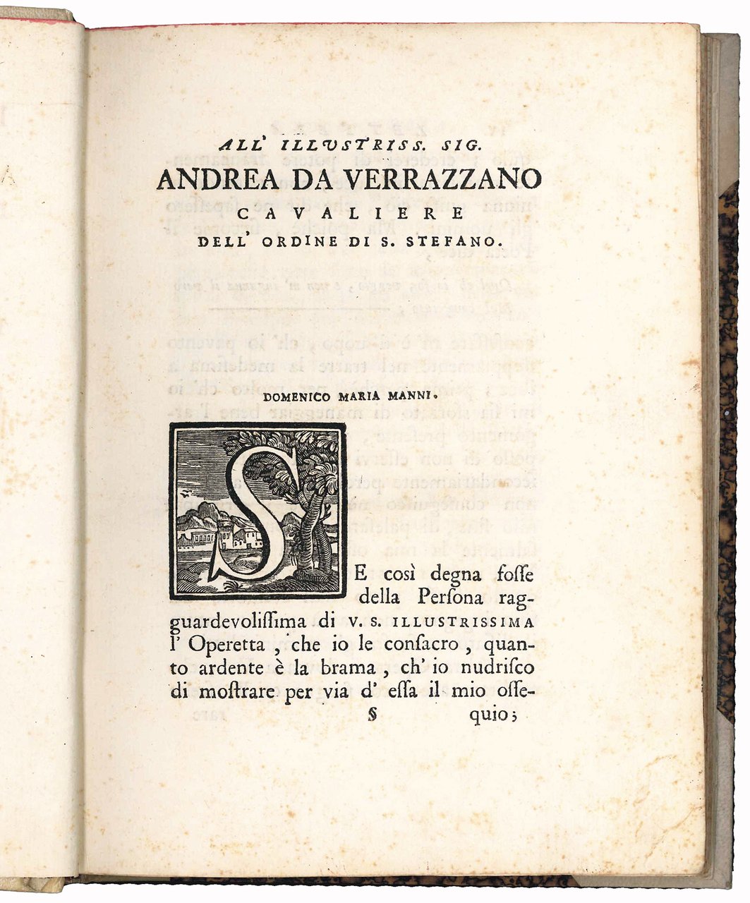 Domencio Maria Manni was the son of a modest Florentine printer. Upon his father's death he devoted himself to the study of literature, and, to support his large family, he earned a living by writing remunerative works, supplementing this modest income with a salary as an employee in the Florence Archives. He was a member of the Accademia della Crusca under the name of Sofferente and contributed to the fourth edition of the Vocabolario della Cruca (1729-1738). He wrote numerous works including: Serie dei senatori fiorentini (Florence, 1722); De Florentinis inventis commentarium (Florence, 1731); Lezioni di lingua toscana (Florence, 1737); Istoria del Decamerone (Florence, 1742); Istoria degli anni santi (Florence, 1750); Delle antiche terme di Firenze (Florence, 1751); and Osservazioni istoriche sopra i sigilli dei secoli bassi (Florence, 1739-1764, 30 volumes). In his printing house, he mostly published editions of the classics.