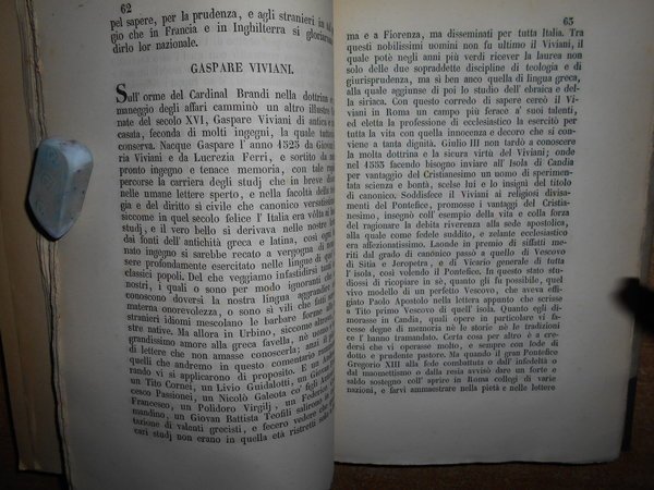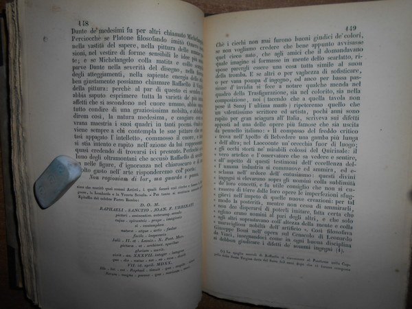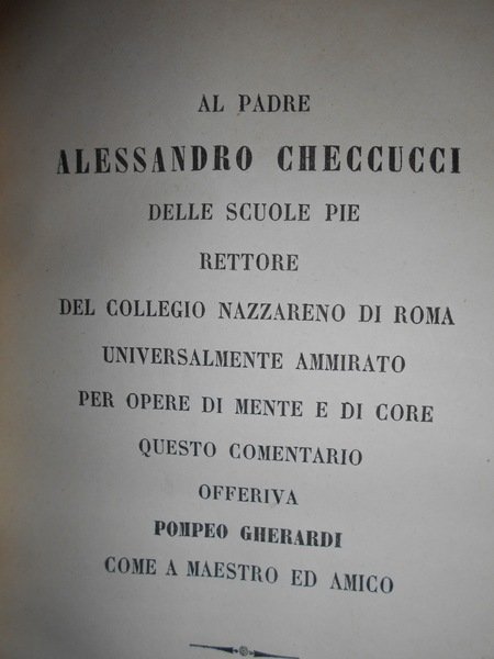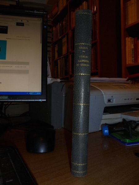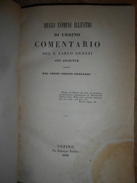 Degli Uomini Illustri di Urbino COMMENTARIO del P. Carlo, Grossi con aggiunte scritte dal Conte Pompeo Gherardi. Urbino, Per Giuseppe Rondini, 1856. In-8°, m. pelle con grandi angoli, fregi e titolo in oro al dorso. 288, (4), 10 pp. Ottimo esemplare (completo) ma con restauro non eseguito a regola d' arte nell' angolo del frontespizio. Uff. A - I - 2