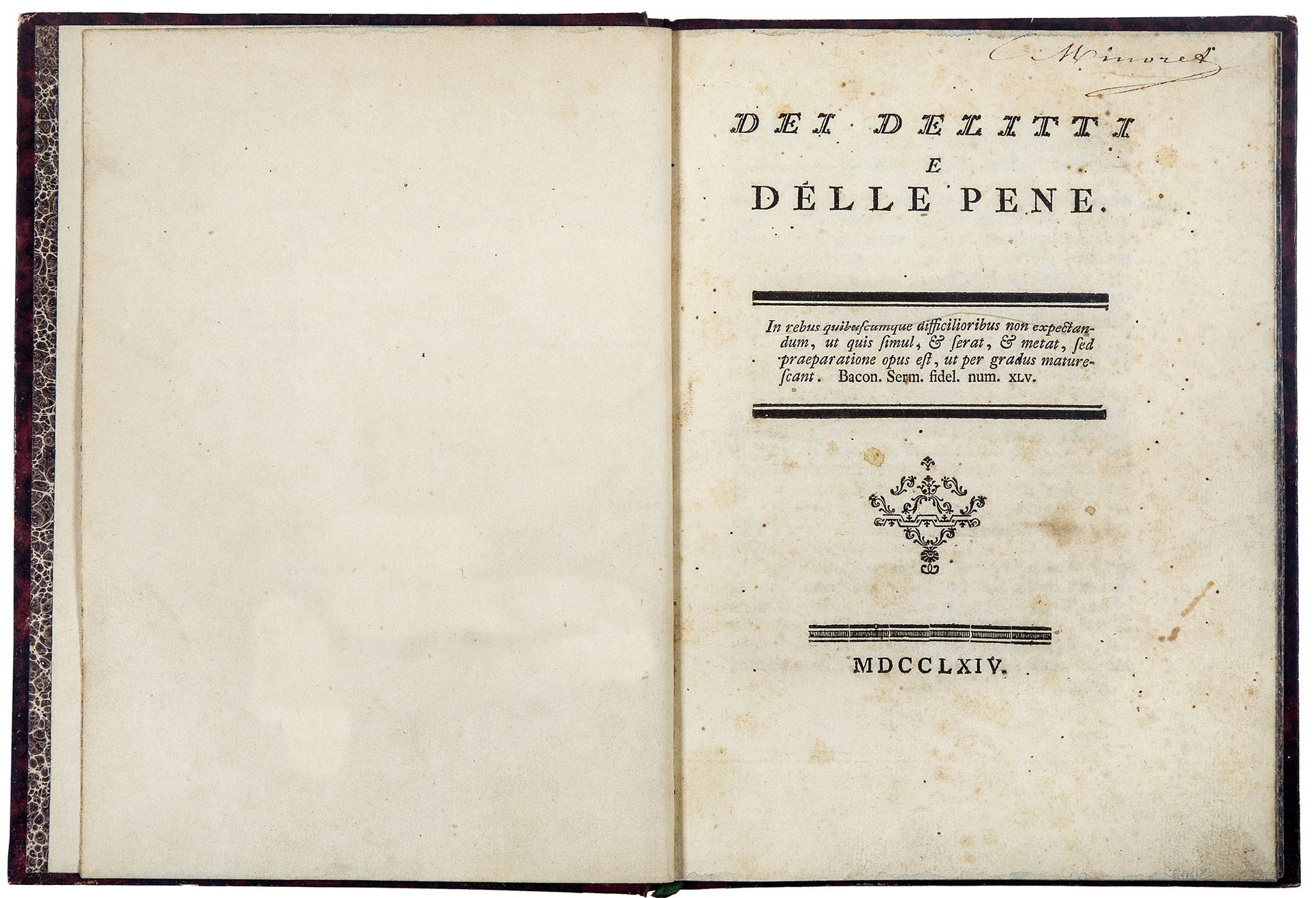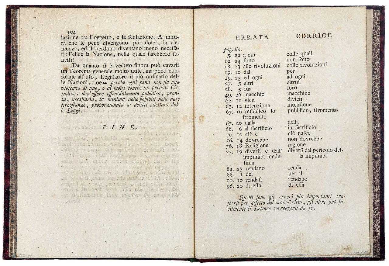 In 4to (mm. 203x145). Pp. 104, [2]. Segnatura: A-N4 χ1. Legatura francese dell'Ottocento in mezzo marocchino rosso, piatti in carta marmorizzata, dorso a quattro nervi con fregi e titolo in oro, risguardi e tagli marmorizzati. Tra le carte di guardia si trova un foglietto sciolto vergato da una mano ottocentesca che contiene uno stralcio contro la tortura tratto dall'Ode à la verité di Volatire. Sul titolo firma di appartenenza di un certo “C. Minoret”. Frontespizio lievemente macchiato, leggera brunitura uniforme, fioriture sparse, ma ottima copia marginosa.