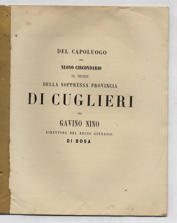 Cagliari, Tip. A. Timon, 1862, in-8, br. muta coeva (priva del dorso e con diversi piccoli fori sulla copertina posteriore, uno strappo, senza mancanze al quella aneriore), pp. 27, [1].