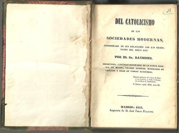 DEL CATOLICISMO EN LAS SOCIEDADES MODERNAS, CONSIDERADO EN SUS RELACIONES CON LAS NECESIDADES DEL SIGLO XIX. | Libri antichi e moderni | Raymond, Sr.