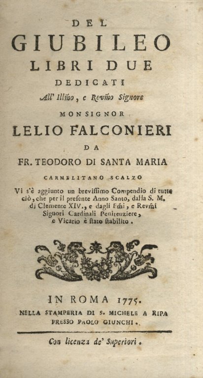 Del Giubileo. Libri due dedicati all'Ill.mo, e Rev.mo Signore Monsignor Lelio Falconieri (.) Vi s'è aggiunto un brevissimo Compendio di tutto ciò, che per il presente Anno Santo, dalla S. M. di Clemente XIV (.) è stato stabilito. (Unito:) Lettera al Chiarissimo autore del Trattato dell'Anno Santo sopra il famoso dubbio se la Visita delle 4 Basiliche (.) possa servire all'acquisto del Giubileo.