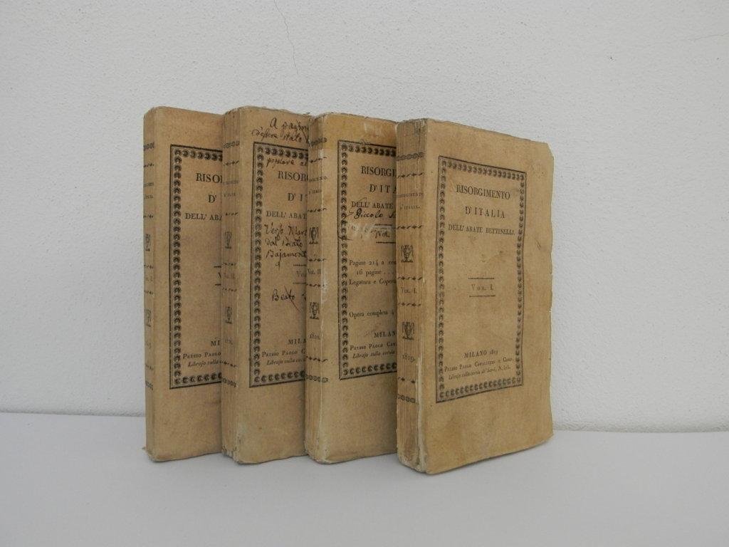 2 parti in 4 volumi, pp. X, 256; 265; 288; 210; brossura editoriale a stampa, titolo al dorso e incorniciato al piatto, alcuni antichi appunti a penna alle copertine; il volume IV presenta nastro adesivo al margine superiore della brossura. Esemplare fresco e con barbe di opera importante sul rinascimento italiano, definito dall'autore "risorgimento". Terza edizione, prima stampata a Milano. Contiene una breve vita dell'autore al primo volume.. *** TUTTI I NOSTRI LIBRI SONO VISIBILI PREVIO CONTATTO MAIL O TELEFONO NELLA NUOVA SEDE DI MILANO: LIBRERIA COSMOPOLIS, VIA JOMMELLI, 22. ***