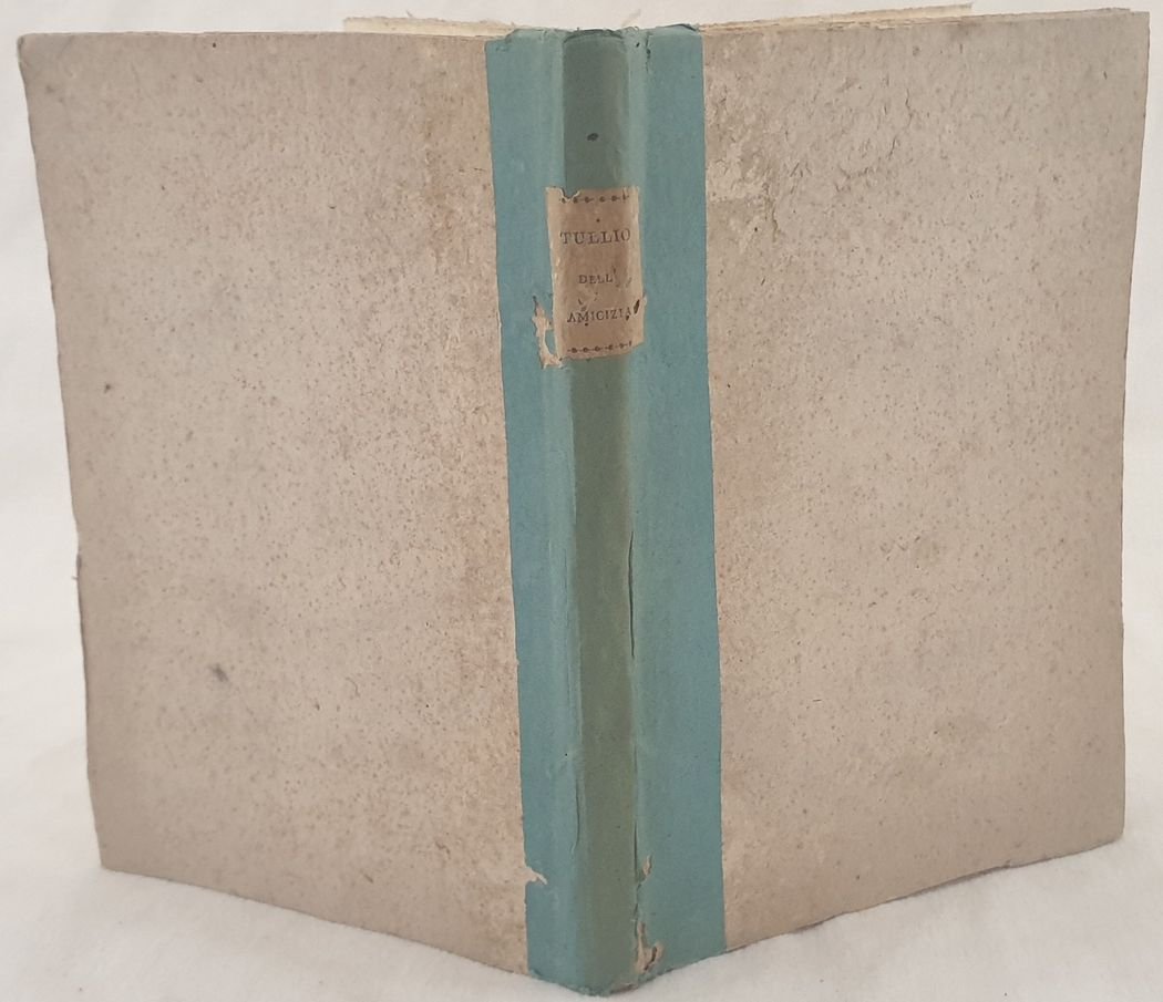 Traduzione italiana del 1809 dell'opera "Dell'amicizia" di Marco Tullio Cicerone a cura di Luigi Clasio (pseudonimo di Luigi Fiacchi) come si evince dalla dedicatoria a Giovanni e Luigi Ricasoli. Fiacchi era membro dell'Accademia della Crusca. In buone condizioni. Copertina cartonata con titolo manoscritto su etichetta al dorso in buone condizioni generali con lievi usure ai margini e dorso. Segno di tarlo. Legatura in buone condizioni. All'interno le pagine si presentano in ottime condizioni con rare fioriture. In 8. Dim. 21x15 cm. Pp. 114.Italian translation of 1809 of the work "Dell'amicizia" by Marco Tullio Cicerone cared by Luigi Clasio (pseudonimous of Luigi Fiacchi) as indicated by the dedicatory to Giovanni and Luigi Ricasoli. Fiacchi was member of Accademia della Crusca. In good conditions. Carton cover with handwritten title on the label in the spine in good general conditions lightly worn in the extremities. Worming. Binding in good conditions. Inside pages are in very good conditions with occasional foxing. Uncut copy. In 8. Dim. 21x15 cm. Pp. 114.