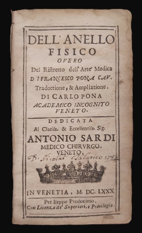 DELL'ANELLO FISICO overo del Ristretto dell'Arte Medica di. Tradottione & Ampliatione di Carlo Pona Academico Incognito Veneto.